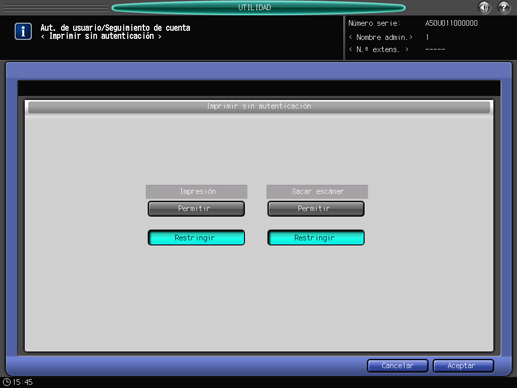 Seleccione si permitir o no sacar el escáner y la impresión para la que no se requiere autenticación.