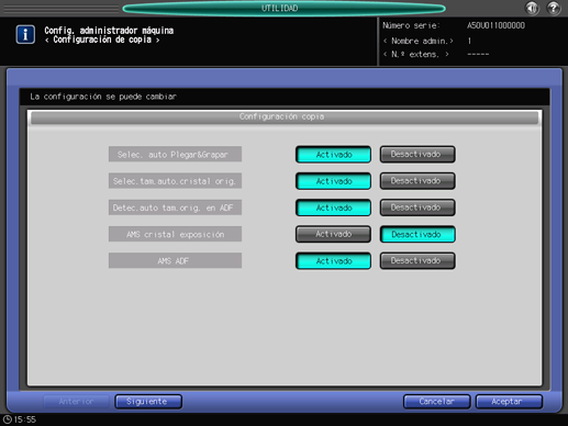 [Borrar marco ADF] | Defina que se borre el marco al realizar copias en el modo ADF. | Ninguno, 1 mm, 2 mm, 3 mm, 4 mm, 5 mm |