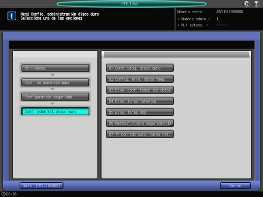Para anular el cambio, pulse [Cancelar]. En cualquiera de los dos casos, vuelve a aparecer la pantalla [Menú Config. administración disco duro].