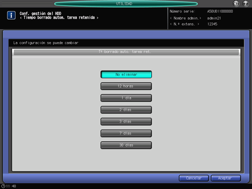 Si selecciona [No eliminar], los datos del HDD no se borran automáticamente.