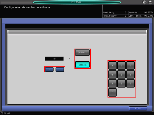 Utilice las teclas de flecha o el teclado del panel táctil para introducir el número de cambio y, a continuación, seleccione [Activ.] o [Desact.].