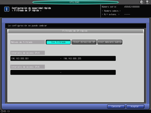 Esta configuración es la misma que la de [Conf.segur.rápida] - [Filtrado de IP rápido], a la que se accede desde la pantalla [UTILIDAD].