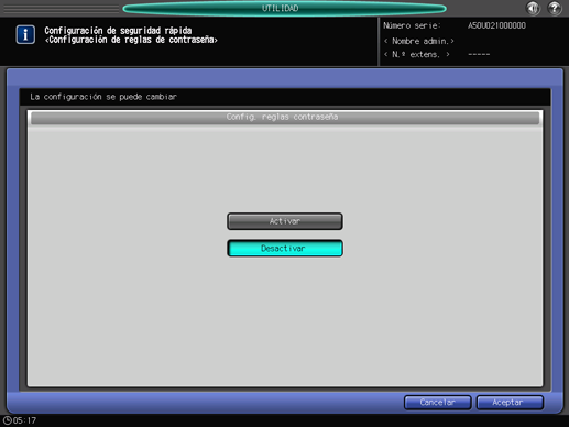 Al seleccionar [Habilitar], se configura la máquina para que la aceptación de las contraseñas especificadas sea más estricta de lo normal, de acuerdo con las reglas de contraseña que se describen a continuación.