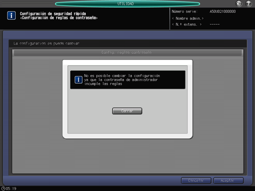 Si pulsa [Activar] con la condición de que la contraseña de administrador predeterminada se mantenga sin cambios o la contraseña de administrador no cumpla las reglas, se muestra un cuadro de diálogo para rechazar la selección. Modifique la contraseña de administrador para cumplir las reglas. Para obtener más información, consulte Contraseña de administrador: cambio de la contraseña de administrador y activación de la función de autenticación de administrador.
