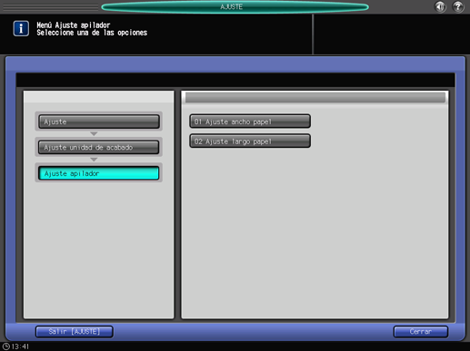 Pulse [Ajuste unidad de acabado], [Ajuste apilador de relevo] y [Ajuste ancho papel] de forma consecutiva.