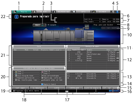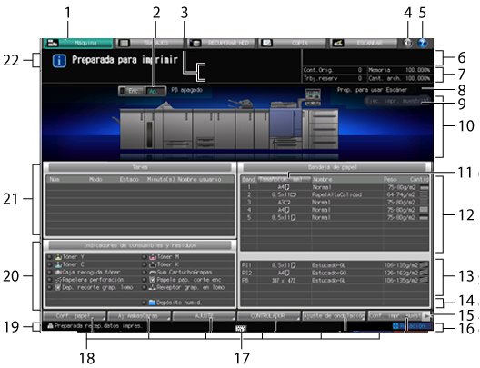 5 | Ayuda | Muestra el mensaje de ayuda que ofrece información sobre la pantalla mostrada en ese momento. En función de la pantalla, Cuando se pulsa en la pantalla [Máquina], se muestran las instrucciones para sustituir el tóner, sustituir la caja de tóner residual, añadir grapas, eliminar los restos de perforación, grapado y recorte, añadir cápsulas de cola y cargar papel. |