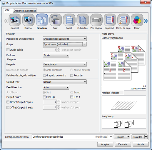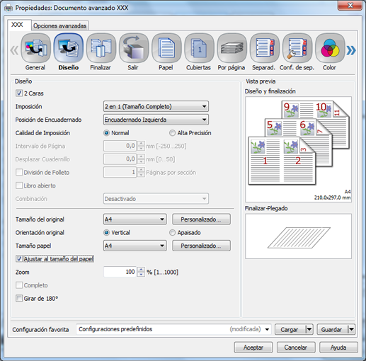 Cuando realice ajustes en el controlador de impresora, compruebe que no hayan quedado ajustes anteriores en las pestañas [Diseño], [Finalizar], [Cubiertas], etc.