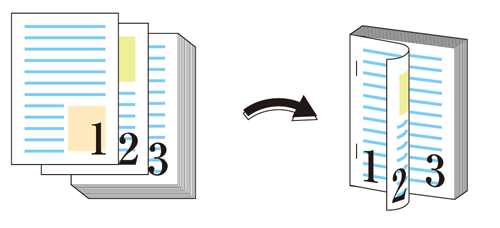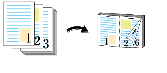 Imprima en dos caras y grape con la unidad de acabado. En esta sección, se describe cómo se imprime con el mismo tamaño que el original y cómo se imprime con 2 en 1 (tamaño reducido).