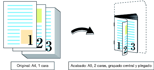 Folleto: imposición de un original A4 sobre papel A4 (Impresión reducida/Acabado en tamaño A5)