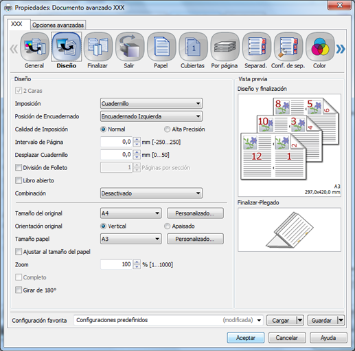 Cuando realice ajustes en el controlador de impresora, compruebe que no hayan quedado ajustes anteriores en las pestañas [Diseño], [Finalizar], [Cubiertas], etc.