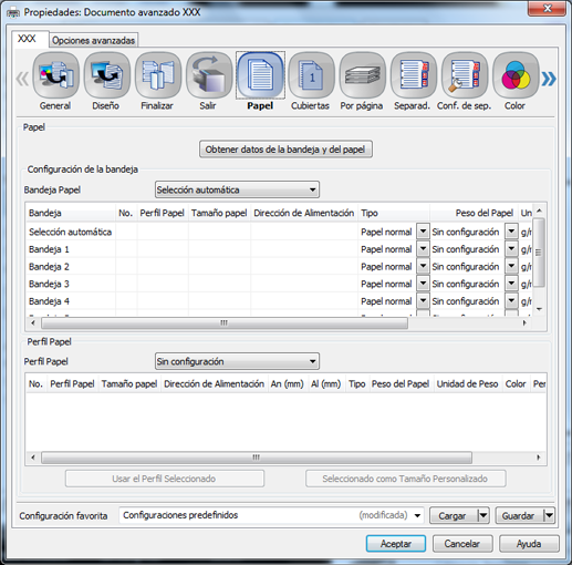 Haga clic en la pestaña [Papel] y, a continuación, haga clic en [Obtener datos de la bandeja y del papel].