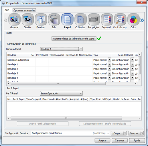 Cuando se obtienen los datos de la bandeja y del papel, se visualiza una marca de verificación en verde.