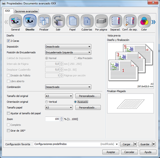 Cuando realice ajustes en el controlador de impresora, compruebe que no hayan quedado ajustes anteriores en las pestañas [Diseño], [Finalizar], [Cubiertas], etc.