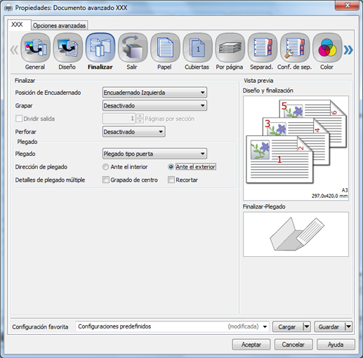 Haga clic en la pestaña [Finalizar] y, a continuación, ajuste [Plegado] y [Dirección de plegado].