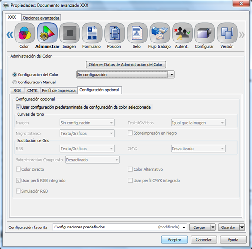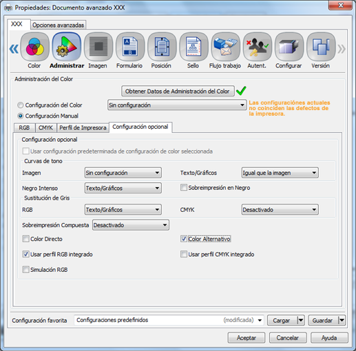 Si no se han podido obtener los datos de administración del color, se visualiza una marca x en rojo.