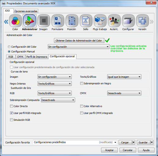 Cuando se obtienen los datos de administración del color, se visualiza una marca de verificación en verde.