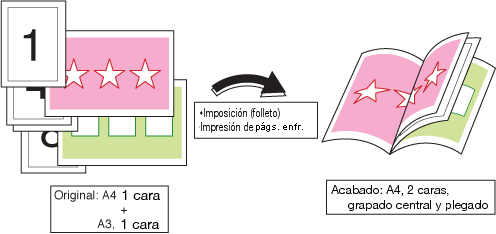 Acabado con impresión de libro abierto. En esta sección, se explica cómo imprimir los datos de originales de varios tamaños en un libro abierto.