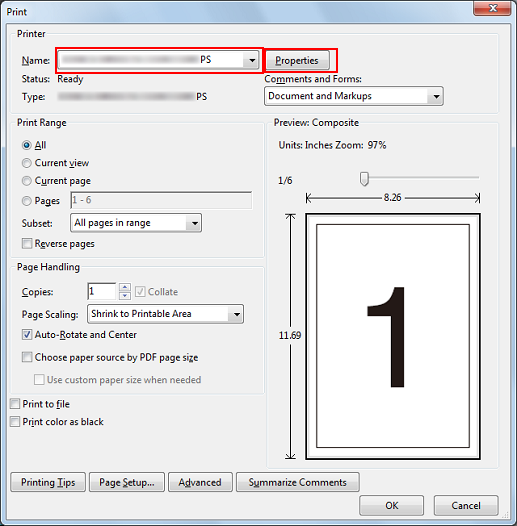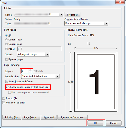 Introduzca las [Copias] en la pantalla [Imprimir], seleccione [Elegir fuente de papel por tamaño de página de PDF] y, a continuación, haga clic en [OK].