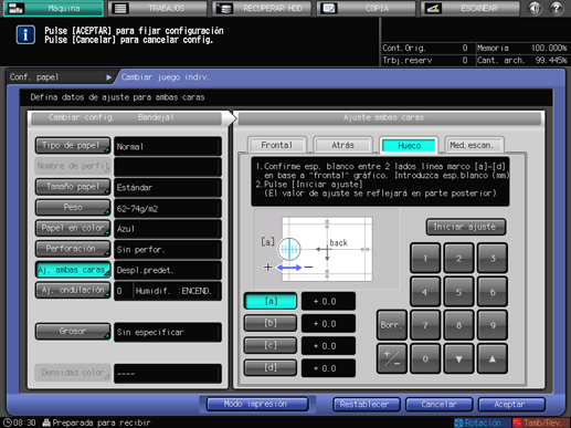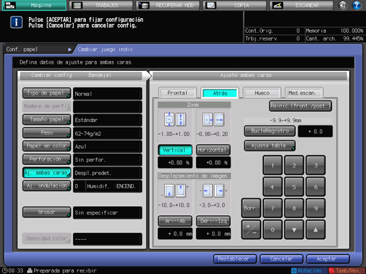 Ejemplo: Ajuste la ampliación horizontal/vertical para la cara [Atrás]. Para ajustar la ampliación horizontal/vertical de la cara anterior, pulse [Frontal].
