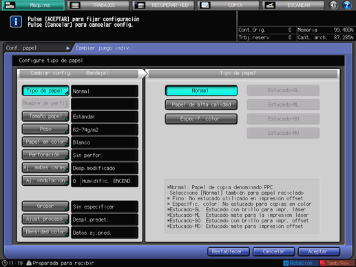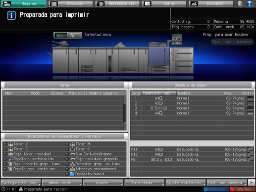 En el panel táctil de la unidad principal, pulse [Configuración pap.] en la pantalla [Máquina].