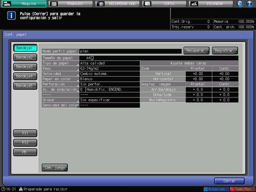 Seleccione la bandeja en la que ha cargado el papel y pulse [Cam. juego].