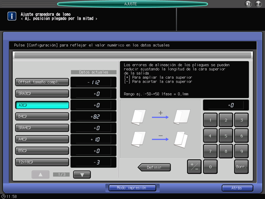 Cuando la posición de plegado central para el grapado en el lomo esté desalineada