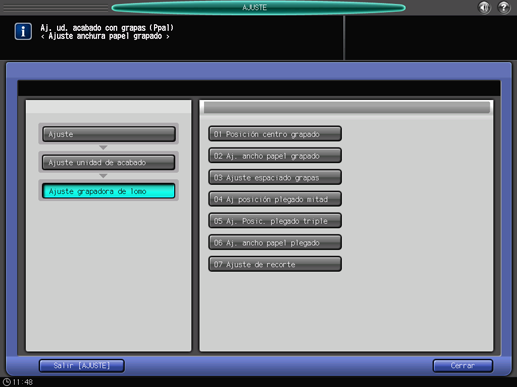 Pulse [Ajuste unidad de acabado] en la pantalla [Menú Ajuste].