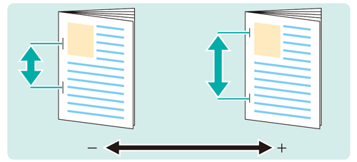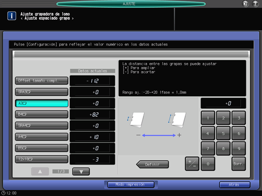 Cuando la separación de las grapas del grapado en el lomo es demasiado ancha o demasiado estrecha, esta función permite ajustar el espaciado especificando el valor deseado.