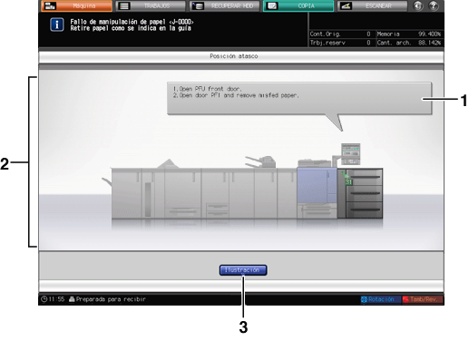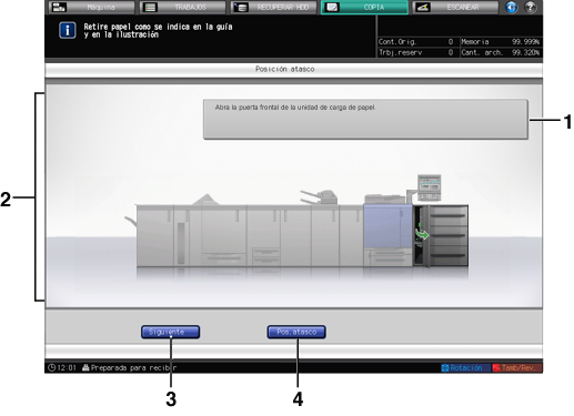 • Puede visualizarse un código de atasco en la zona de mensajes de la pantalla [Posición atasco]. Para obtener más información, póngase en contacto con el servicio de asistencia técnica.