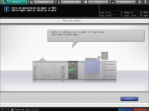 Cuando se produce un atasco de papel en el encuadernador en espiral automático GP-502 durante una tarea de impresión, aparecerá el siguiente mensaje en la pantalla de la unidad principal.