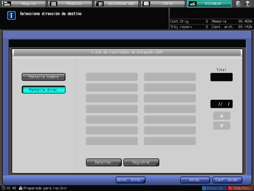 Permite recuperar de la base de datos del servidor LDAP los datos que cumplan las condiciones de búsqueda introducidas en el panel de control. También se puede seleccionar la dirección de correo electrónico obtenida y, a continuación, transmitir y registrar los datos de escaneado.