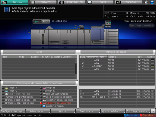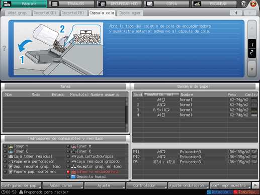 El indicador de cola del encuadernador se ilumina en color rojo en la zona [Indicadores de consumibles y residuos] de la pantalla [Máquina].