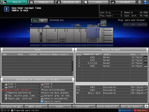 El indicador de la caja de tóner residual también le informa de que la caja está llena cuando se ilumina en color rojo en el área [Indicadores de consumibles y residuos] de la pantalla [Máquina].