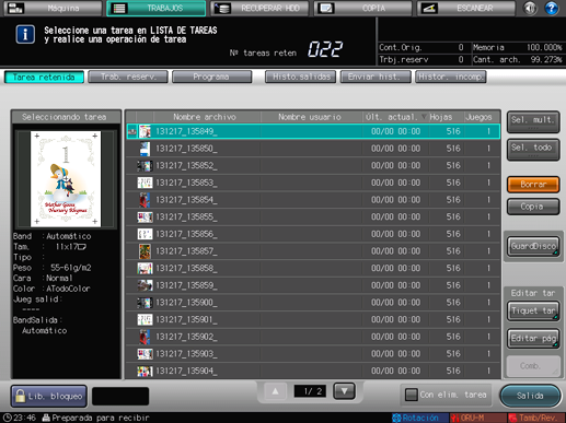 En Job Centro, solo puede editar tareas de impresión (el [Tipo tarea] es [Imprimir]). Para editar tareas de copia (el [Tipo tarea] es [Copia]), utilice el panel táctil del cuerpo principal.