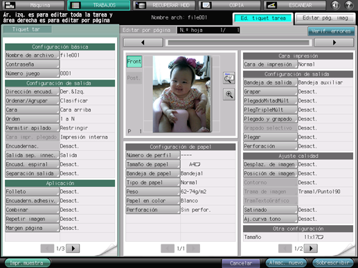 Para visualizar la pantalla [Editar página] (consulte la Utilización del disco duro: Edición de una tarea retenida página a página (Editar página), pulse la ficha [Editar pág. imag]. Para volver a la pantalla [Ed. tiquet tarea], pulse la ficha [Ed. tiquet tarea].