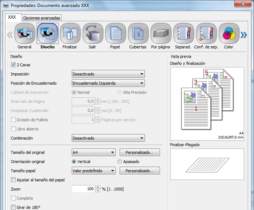 [Diseño] | 2 caras, imposición, dirección de encuadernación, calidad de imposición, espaciado de página, desplazamiento exterior, folleto dividido, libro abierto/impresión de póster/tamaño de papel |