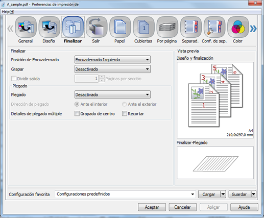 [Configuración de salida] | Defina [Bandeja de salida] [Grapar] [PlegadoMitadMúlt] [PlegTripleMúlt] [Plegado y grapado] [Perforación] [Plegar], etc. | |