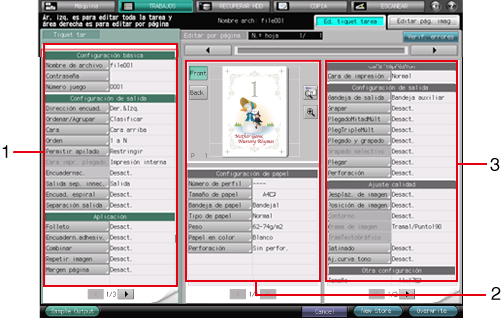 2. Panel central de la pantalla | Visualización de imagen en vista previa | Visualiza la imagen de vista previa del archivo seleccionado. Puede visualizar la vista previa del lado frontal y posterior de un original a 2 caras, y comprobar la vista girada o la dirección de salida de la imagen. En la pantalla para ampliar la vista previa, puede definir la marca de recorte, la posición de imagen o la función desplazamiento de imagen. |