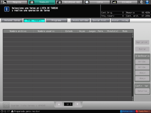 En el panel táctil del cuerpo principal, pulse [TRABAJOS].