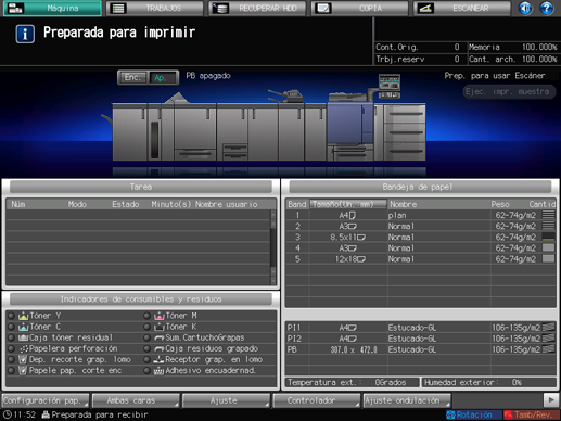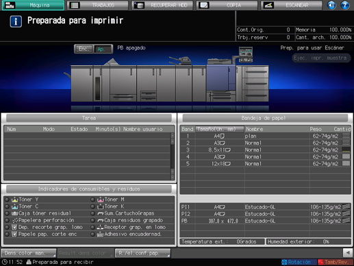 En el panel táctil de la unidad principal, pulse [Configuración pap.] en la pantalla [Máquina].