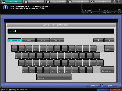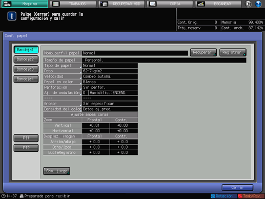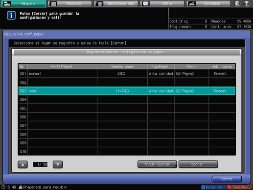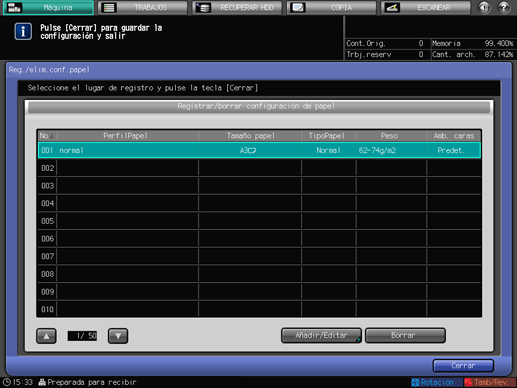 Se puede registrar, editar, borrar o recuperar un perfil de papel en la pantalla [Registrar/borrar configuración de papel].
