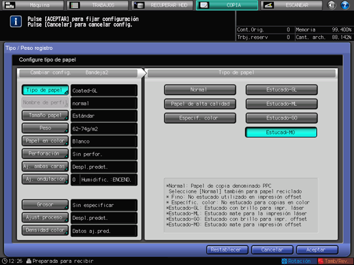 Puede establecer [Tipo de papel] / [Nombre de perfil] / [Tamaño papel] / [Peso] / [Papel en color] / [Perforación] / [Aj. ambas caras] / [Aj. ondulación] / [Grosor] / [Densidad color].