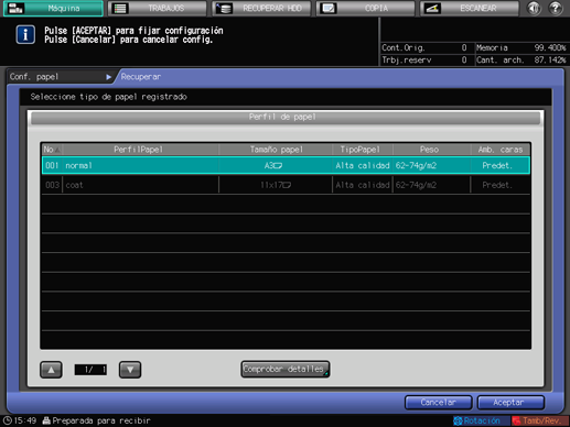 Pulse en el perfil de papel que desea recuperar y pulse [Aceptar].