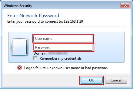 ii. Si aparece el diálogo de error de [Seguridad de Windows], introduzca [Nombre de usuario] y [Contraseña] y, a continuación, haga clic en [OK].