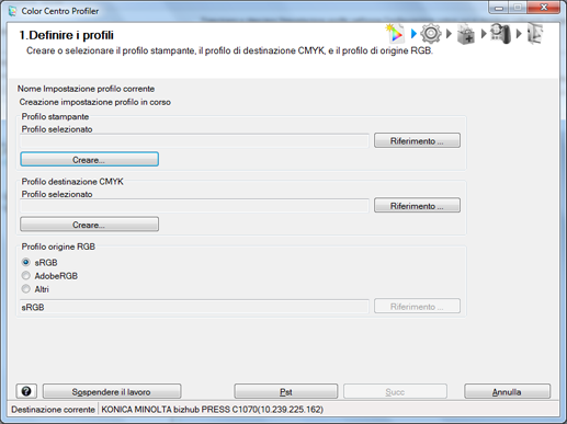 Specificare il profilo destinazione CMYK usato dall'Impostazione profilo. Quando si usa il profilo destinazione CMYK esistente, fare clic su [Riferimento]. Quando si crea il nuovo profilo destinazione CMYK esistente, fare clic su [Creare].