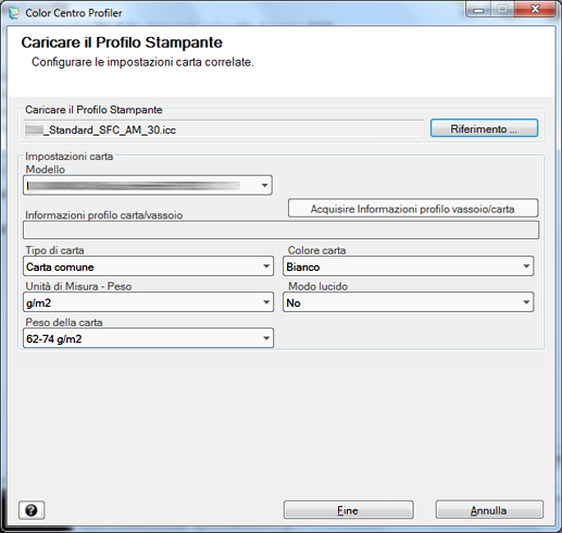 Il profilo stampante selezionato è visualizzato in [Caricare il Profilo Stampante]. Specificare [Tipo di carta], [Colore carta], e [Peso della carta] come necessario. Successivamente, fare clic su [Fine] per tornare alla schermata [1. Definire i profili].