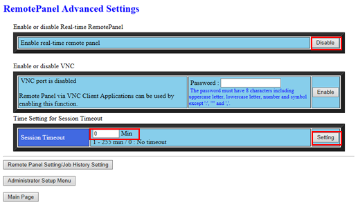 La schermata [Remote Panel Advanced Settings] consente di disattivare il Real-time Remote Panel o di impostare l'ora per la sessione di timeout.