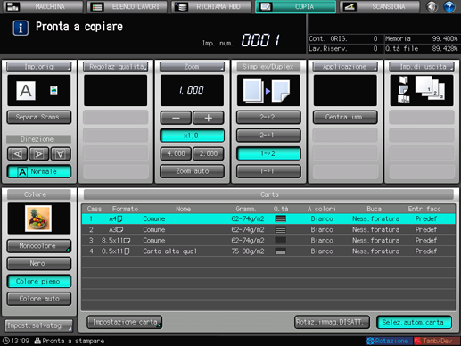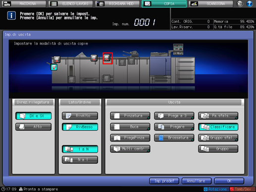 • Lo Stacker ad alta capacità LS-505 o Stacker ad alta capacità LS-506 montato con la macchina può visualizzare [imp.Pila]. Inoltre, lo Stacker ad alta capacità LS-505 o 2 unità dello Stacker ad alta capacità LS-506 montato con la macchina possono visualizzare [Stacker auto]. Per informazioni dettagliate, fare riferimento a Consentire l'impilamento di carta da diversi lavori e Passaggio automatico allo stacker.