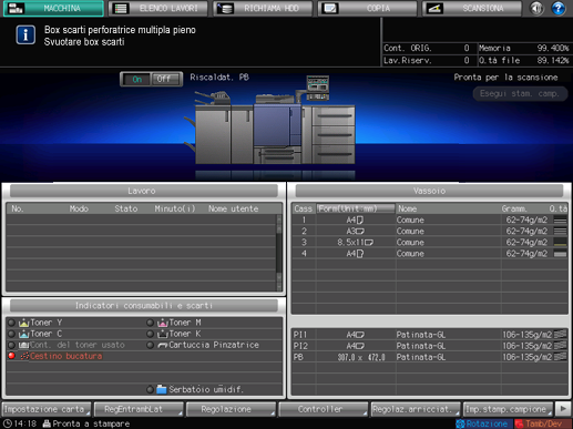 Inoltre, la spia [Cestino bucatura] si illumina di rosso nell'area Indicatori consumabili e scarti della schermata [MACCHINA].