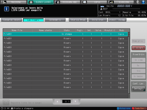 Premere la scheda [ELENCO LAVORI] nello schermo.